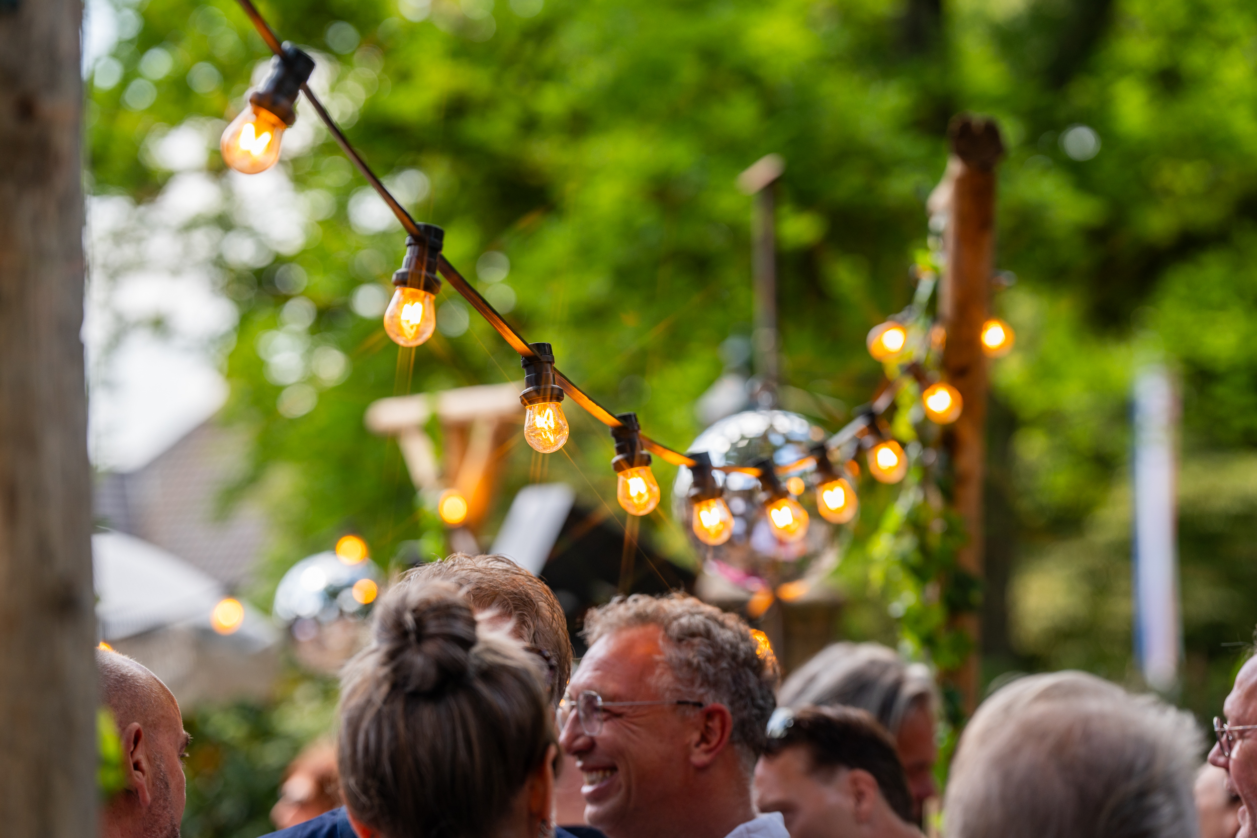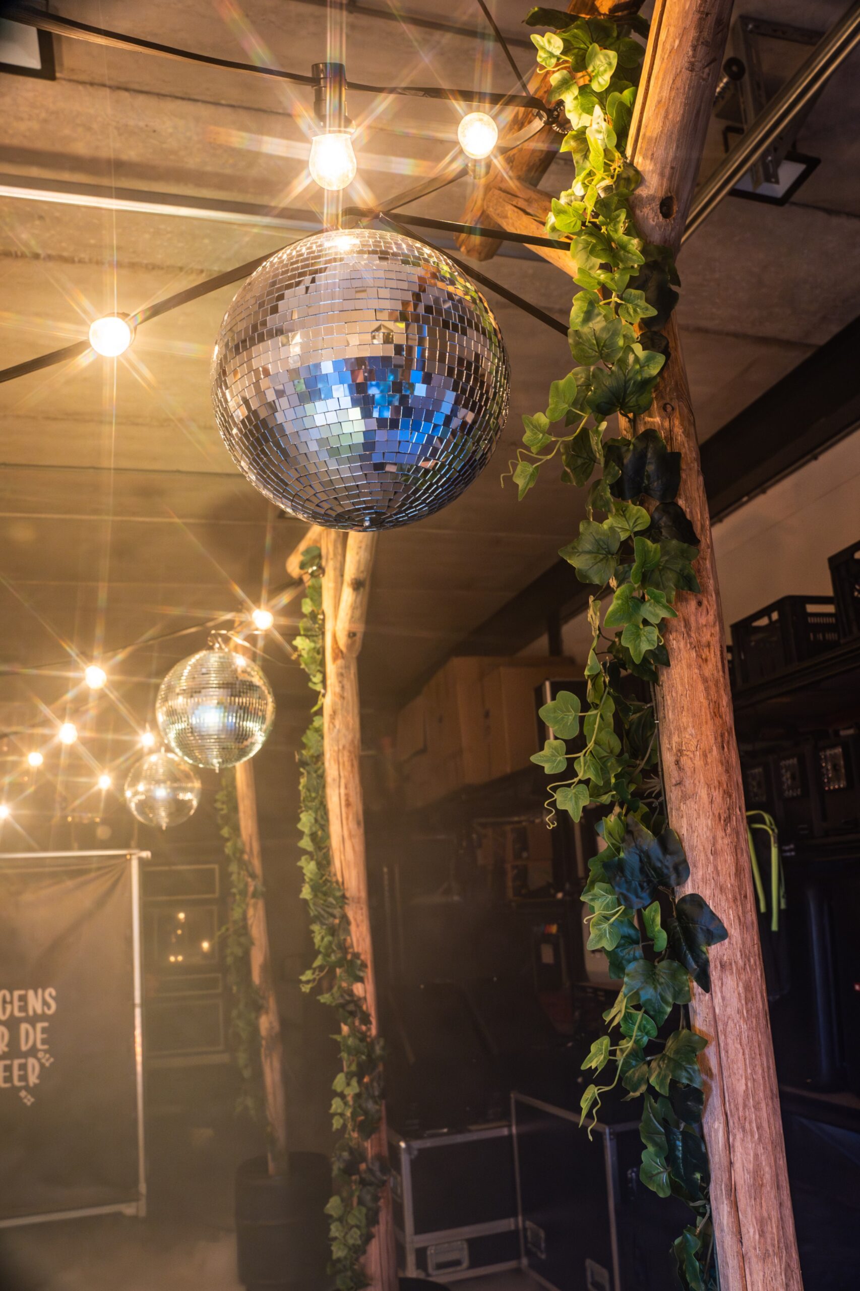Plaatje hé? De prikkabel palen van kastanje hout, natuurlijke klimop en bevestigde spiegelbol zijn de finishing touch op elk evenement. De prikkabel slingers (per 25 M) zijn dimbaar waardoor ze in elke setting een toevoegende factor zullen bieden. Plaats ze in een rondje, kris kras door elkaar of zigzaggend tegen over elkaar, het maakt allemaal niet uit.